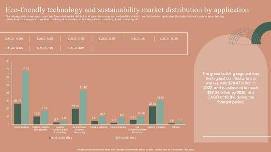 The following slide showcases current and forecasted market distribution of green technology and sustainability industry revenue based on application. It includes elements such as green building, carbon footprint management, weather monitoring and forecasting, air and water pollution monitoring, forest monitoring, etc. Are you searching for a Green Technology And Sustainability Market Distribution By Application Demonstration PDF that is uncluttered, straightforward, and original Its easy to edit, and you can change the colors to suit your personal or business branding. For a presentation that expresses how much effort you have put in, this template is ideal With all of its features, including tables, diagrams, statistics, and lists, its perfect for a business plan presentation. Make your ideas more appealing with these professional slides. Download Green Technology And Sustainability Market Distribution By Application Demonstration PDF from Slidegeeks today.