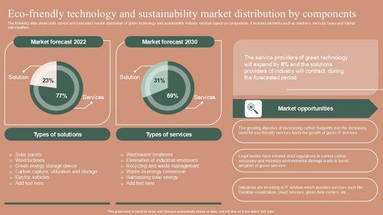 The following slide showcases current and forecasted market distribution of green technology and sustainability industry revenue based on components. It includes elements such as solutions, services, types and market opportunities. Boost your pitch with our creative Eco Friendly Technology And Sustainability Market Distribution By Components Template PDF. Deliver an awe-inspiring pitch that will mesmerize everyone. Using these presentation templates you will surely catch everyones attention. You can browse the ppts collection on our website. We have researchers who are experts at creating the right content for the templates. So you do not have to invest time in any additional work. Just grab the template now and use them.