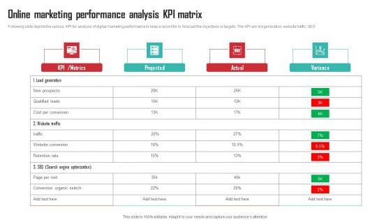Following slide depicts the various KPI for analysis of digital marketing performance to keep a record for to forecast the objectives or targets. The KPI are led generation, website traffic, SEO. Showcasing this set of slides titled Online Marketing Performance Analysis KPI Matrix Summary PDF. The topics addressed in these templates are Lead Generation, Website Traffic, SEO Search Engine Optimization. All the content presented in this PPT design is completely editable. Download it and make adjustments in color, background, font etc. as per your unique business setting.