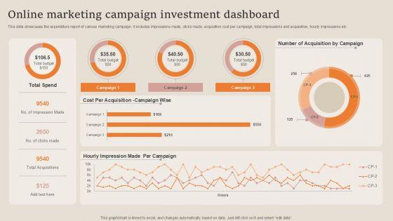 This slide showcases the expenditure report of various marketing campaign. It includes impressions made, clicks made, acquisition cost per campaign, total impressions and acquisition, hourly impressions etc. Showcasing this set of slides titled Online Marketing Campaign Investment Dashboard Topics PDF. The topics addressed in these templates are Online Marketing Campaign, Investment Dashboard. All the content presented in this PPT design is completely editable. Download it and make adjustments in color, background, font etc. as per your unique business setting.