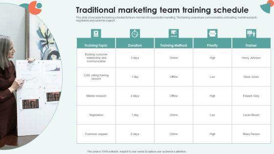 This slide showcases the training schedule for team members for successful marketing. The training covered are communication, cold calling, market research, negotiation and customer support. Welcome to our selection of the Traditional Marketing Team Training Schedule Ppt Ideas Layout Ideas PDF. These are designed to help you showcase your creativity and bring your sphere to life. Planning and Innovation are essential for any business that is just starting out. This collection contains the designs that you need for your everyday presentations. All of our PowerPoints are 100 percent editable, so you can customize them to suit your needs. This multi purpose template can be used in various situations. Grab these presentation templates today.