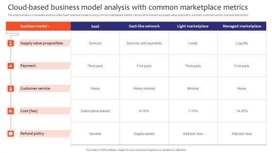 The slide includes a comparative analysis of the SaaS business model by using common marketplace metrics. Various KPIs involved are supply value proposition, payment, customer service, cost and refund policy. Showcasing this set of slides titled Cloud Based Business Model Analysis With Common Marketplace Metrics Introduction PDF. The topics addressed in these templates are Supply Value Proposition, Payment, Customer Service, Cost, Refund Policy. All the content presented in this PPT design is completely editable. Download it and make adjustments in color, background, font etc. as per your unique business setting.