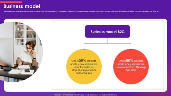 The following slide showcases business model of chat platforms promoting digital art. It comprises of components such as business to business B2B, offering profits to artists when stickers are downloaded from app and iMessage App store, etc. Boost your pitch with our creative Business Model Emoji Marketplace Investor Funding Elevator Pitch Deck. Deliver an awe-inspiring pitch that will mesmerize everyone. Using these presentation templates you will surely catch everyones attention. You can browse the ppts collection on our website. We have researchers who are experts at creating the right content for the templates. So you do not have to invest time in any additional work. Just grab the template now and use them. The following slide showcases business model of chat platforms promoting digital art. It comprises of components such as business to business B2B, offering profits to artists when stickers are downloaded from app and iMessage App store, etc.