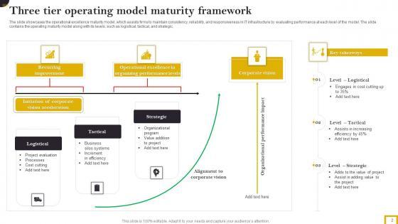 The slide showcases the operational excellence maturity model, which assists firms to maintain consistency, reliability, and responsiveness in IT infrastructure by evaluating performance at each level of the model. The slide contains the operating maturity model along with its levels, such as logistical, tactical, and strategic. Showcasing this set of slides titled Three Tier Operating Model Maturity Framework Themes Pdf. The topics addressed in these templates are Levels, Logistical, Tactical, Strategic. All the content presented in this PPT design is completely editable. Download it and make adjustments in color, background, font etc. as per your unique business setting. The slide showcases the operational excellence maturity model, which assists firms to maintain consistency, reliability, and responsiveness in IT infrastructure by evaluating performance at each level of the model. The slide contains the operating maturity model along with its levels, such as logistical, tactical, and strategic.