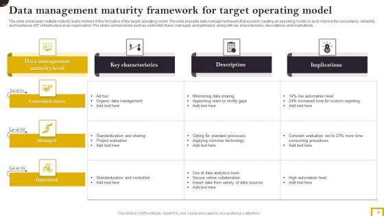 The slide showcases multiple maturity levels involved in the formation of the target operating model. The slide presents data management levels that assist in creating an operating model so as to improve the consistency, reliability, and resilience of IT infrastructure in an organization. The slides contain levels such as controlled chaos, managed, and optimized, along with key characteristics, descriptions, and implications. Pitch your topic with ease and precision using this Data Management Maturity Framework For Target Operating Model Graphics Pdf. This layout presents information on Key Characteristics, Descriptions, Implications. It is also available for immediate download and adjustment. So, changes can be made in the color, design, graphics or any other component to create a unique layout. The slide showcases multiple maturity levels involved in the formation of the target operating model. The slide presents data management levels that assist in creating an operating model so as to improve the consistency, reliability, and resilience of IT infrastructure in an organization. The slides contain levels such as controlled chaos, managed, and optimized, along with key characteristics, descriptions, and implications.