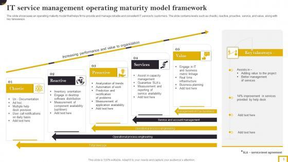The slide showcases an operating maturity model that helps firms provide and manage reliable and consistent IT service to customers. The slide contains levels such as chaotic, reactive, proactive, service, and value, along with key takeaways. Pitch your topic with ease and precision using this IT Service Management Operating Maturity Model Framework Infographics Pdf. This layout presents information on Chaotic, Reactive, Proactive, Service. It is also available for immediate download and adjustment. So, changes can be made in the color, design, graphics or any other component to create a unique layout. The slide showcases an operating maturity model that helps firms provide and manage reliable and consistent IT service to customers. The slide contains levels such as chaotic, reactive, proactive, service, and value, along with key takeaways.