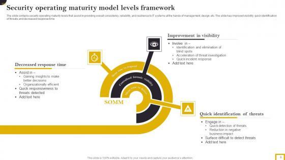The slide contains security operating maturity levels that assist in providing overall consistency, reliability, and resilience to IT systems at the hands of management, design, etc. The slide has improved visibility, quick identification of threats,and decreased response time. Pitch your topic with ease and precision using this Security Operating Maturity Model Levels Framework Elements Pdf. This layout presents information on Decreased Response Time,Improvement Visibility, Quick Identification Threats. It is also available for immediate download and adjustment. So, changes can be made in the color, design, graphics or any other component to create a unique layout. The slide contains security operating maturity levels that assist in providing overall consistency, reliability, and resilience to IT systems at the hands of management, design, etc. The slide has improved visibility, quick identification of threats,and decreased response time.