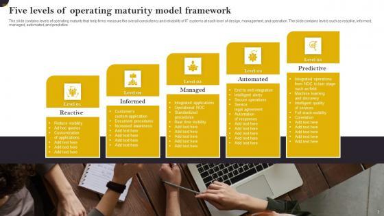 The slide contains levels of operating maturity that help firms measure the overall consistency and reliability of IT systems at each level of design, management, and operation. The slide contains levels such as reactive, informed, managed, automated, and predictive. Pitch your topic with ease and precision using this Five Levels Of Operating Maturity Model Framework Designs Pdf. This layout presents information on Reactive, Informed, Managed, Automated. It is also available for immediate download and adjustment. So, changes can be made in the color, design, graphics or any other component to create a unique layout. The slide contains levels of operating maturity that help firms measure the overall consistency and reliability of IT systems at each level of design, management, and operation. The slide contains levels such as reactive, informed, managed, automated, and predictive.