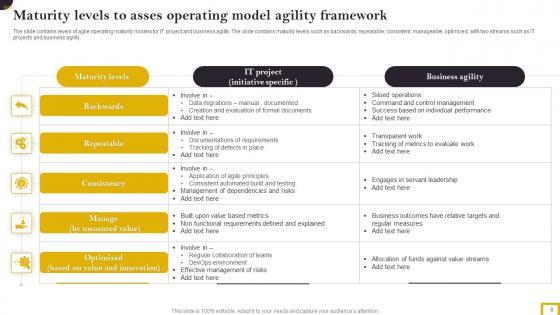 The slide contains levels of agile operating maturity models for IT project and business agility. The slide contains maturity levels such as backwards, repeatable, consistent, manageable, optimized, with two streams such as IT projects and business agility. Showcasing this set of slides titled Maturity Levels To Asses Operating Model Agility Framework Mockup Pdf. The topics addressed in these templates are Repeatable, Consistent, Manageable, Optimized. All the content presented in this PPT design is completely editable. Download it and make adjustments in color, background, font etc. as per your unique business setting. The slide contains levels of agile operating maturity models for IT project and business agility. The slide contains maturity levels such as backwards, repeatable, consistent, manageable, optimized, with two streams such as IT projects and business agility.
