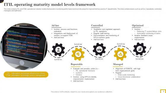 The slide contains ITIL and ITSM operational maturity models that assist in monitoring performance and look into areas for improvement as used by IT departments. The slide contains levels such as ad-hoc, repeatable, controlled, managed, and optimized. Showcasing this set of slides titled ITIL Operating Maturity Model Levels Framework Topics Pdf. The topics addressed in these templates are Repeatable, Controlled, Managed. All the content presented in this PPT design is completely editable. Download it and make adjustments in color, background, font etc. as per your unique business setting. The slide contains ITIL and ITSM operational maturity models that assist in monitoring performance and look into areas for improvement as used by IT departments. The slide contains levels such as ad-hoc, repeatable, controlled, managed, and optimized.