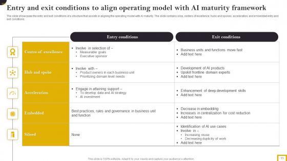 The slide showcases the entry and exit conditions of a structure that assists in aligning the operating model with AI maturity. The slide contains silos, centers of excellence, hubs and spokes, acceleration, and embedded entry and exit conditions. Showcasing this set of slides titled Entry And Exit Conditions To Align Operating Model With Ai Maturity Framework Infographics Pdf. The topics addressed in these templates are Centers Excellence, Hubs And Spokes, Acceleration And Embedded. All the content presented in this PPT design is completely editable. Download it and make adjustments in color, background, font etc. as per your unique business setting. The slide showcases the entry and exit conditions of a structure that assists in aligning the operating model with AI maturity. The slide contains silos, centers of excellence, hubs and spokes, acceleration, and embedded entry and exit conditions.