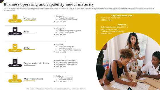 The slide shows levels of business operating and capability model maturity. The slide contains levels such as value chain, sales, CRM, segmentation of customers, opportunity-based, etc. with a capability based view and how it assists business. Showcasing this set of slides titled Business Operating And Capability Model Maturity Clipart Pdf. The topics addressed in these templates are Value Chain, Sales, CRM. All the content presented in this PPT design is completely editable. Download it and make adjustments in color, background, font etc. as per your unique business setting. The slide shows levels of business operating and capability model maturity. The slide contains levels such as value chain, sales, CRM, segmentation of customers, opportunity-based, etc. with a capability based view and how it assists business.