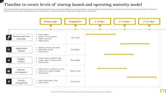 The slide showcases a timeline that allows businesses to find out the time consumed in shifting from one step to another. The slide contains levels that assist in creating a startup launch and operating models. The levels are ideation and team formation, opportunity analysis, viability analysis, solution development, assignment management, and action steps. Pitch your topic with ease and precision using this Timeline To Create Levels Of Startup Launch And Operating Maturity Model Themes Pdf. This layout presents information on Team Formation, Opportunity Analysis, Viability Analysis. It is also available for immediate download and adjustment. So, changes can be made in the color, design, graphics or any other component to create a unique layout. The slide showcases a timeline that allows businesses to find out the time consumed in shifting from one step to another. The slide contains levels that assist in creating a startup launch and operating models. The levels are ideation and team formation, opportunity analysis, viability analysis, solution development, assignment management, and action steps.