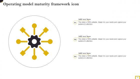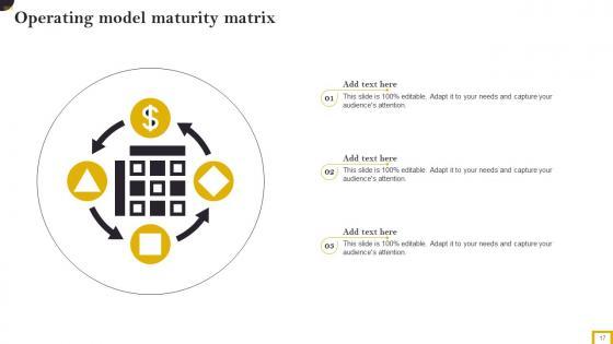 Improve your presentation delivery using this Operating Model Maturity Framework Ppt PowerPoint Presentation Complete Deck With Slides. Support your business vision and objectives using this well-structured PPT deck. This template offers a great starting point for delivering beautifully designed presentations on the topic of your choice. Comprising eighteen slides this professionally designed template is all you need to host discussion and meetings with collaborators. Each slide is self-explanatory and equipped with high-quality graphics that can be adjusted to your needs. Therefore, you will face no difficulty in portraying your desired content using this PPT slideshow. This PowerPoint slideshow contains every important element that you need for a great pitch. It is not only editable but also available for immediate download and utilization. The color, font size, background, shapes everything can be modified to create your unique presentation layout. Therefore, download it now. Our Operating Model Maturity Framework Ppt PowerPoint Presentation Complete Deck With Slides are topically designed to provide an attractive backdrop to any subject. Use them to look like a presentation pro.