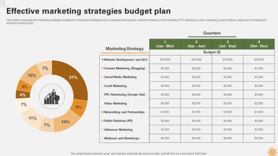 This slides showcases the marketing strategies budget plan. It includes strategies such as website development, content marketing, email marketing, PPC advertising, video marketing, public relations, influencer marketing and webinars and workshops. Do you have to make sure that everyone on your team knows about any specific topic I yes, then you should give Effective Marketing Strategies Budget Plan Strategy For Launching A Financial Strategy SS V a try. Our experts have put a lot of knowledge and effort into creating this impeccable Effective Marketing Strategies Budget Plan Strategy For Launching A Financial Strategy SS V. You can use this template for your upcoming presentations, as the slides are perfect to represent even the tiniest detail. You can download these templates from the Slidegeeks website and these are easy to edit. So grab these today This slides showcases the marketing strategies budget plan. It includes strategies such as website development, content marketing, email marketing, PPC advertising, video marketing, public relations, influencer marketing and webinars and workshops.