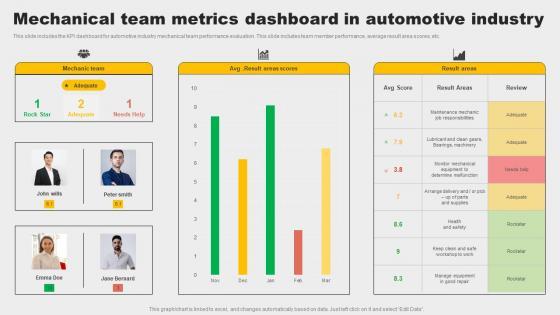 This slide includes the KPI dashboard for automotive industry mechanical team performance evaluation. This slide includes team member performance, average result area scores, etc. Showcasing this set of slides titled Mechanical Team Metrics Dashboard In Automotive Industry Rules Pdf. The topics addressed in these templates are Determine Malfunction, Automotive Industry, Mechanical Team Metrics Dashboard. All the content presented in this PPT design is completely editable. Download it and make adjustments in color, background, font etc. as per your unique business setting. This slide includes the KPI dashboard for automotive industry mechanical team performance evaluation. This slide includes team member performance, average result area scores, etc.