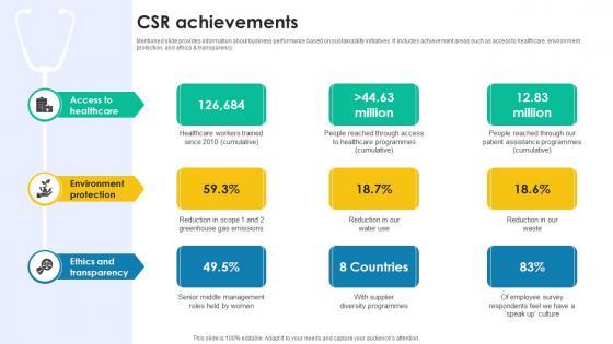 Mentioned slide provides information about business performance based on sustainability initiatives. It includes achievement areas such as access to healthcare, environment protection, and ethics and transparency. Get a simple yet stunning designed Csr Achievements Medical Research And Development Company Profile CP SS V. It is the best one to establish the tone in your meetings. It is an excellent way to make your presentations highly effective. So, download this PPT today from Slidegeeks and see the positive impacts. Our easy-to-edit Csr Achievements Medical Research And Development Company Profile CP SS V can be your go-to option for all upcoming conferences and meetings. So, what are you waiting for Grab this template today. Mentioned slide provides information about business performance based on sustainability initiatives. It includes achievement areas such as access to healthcare, environment protection, and ethics and transparency.