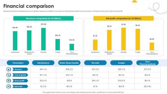 Mentioned slide demonstrates financial comparison between competitors. It includes key financial parameters such as revenue, cost of good sold, gross profit, and net profit. Are you in need of a template that can accommodate all of your creative concepts This one is crafted professionally and can be altered to fit any style. Use it with Google Slides or PowerPoint. Include striking photographs, symbols, depictions, and other visuals. Fill, move around, or remove text boxes as desired. Test out color palettes and font mixtures. Edit and save your work, or work with colleagues. Download Financial Comparison Medical Research And Development Company Profile CP SS V and observe how to make your presentation outstanding. Give an impeccable presentation to your group and make your presentation unforgettable. Mentioned slide demonstrates financial comparison between competitors. It includes key financial parameters such as revenue, cost of good sold, gross profit, and net profit.