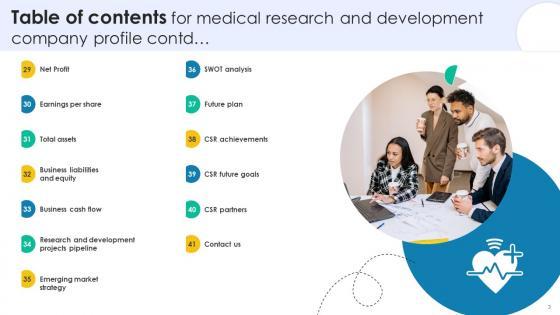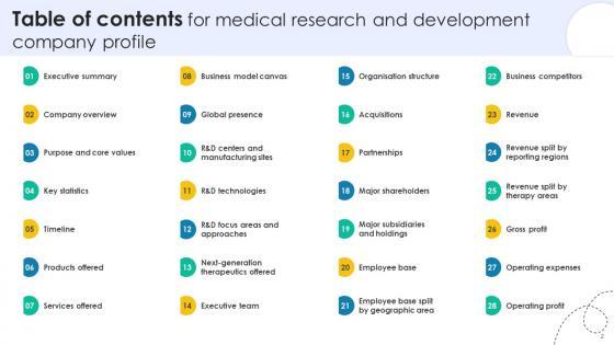 Do you have to make sure that everyone on your team knows about any specific topic I yes, then you should give Table Of Contents For Medical Research And Development Company Profile a try. Our experts have put a lot of knowledge and effort into creating this impeccable Table Of Contents For Medical Research And Development Company Profile. You can use this template for your upcoming presentations, as the slides are perfect to represent even the tiniest detail. You can download these templates from the Slidegeeks website and these are easy to edit. So grab these today Our Table Of Contents For Medical Research And Development Company Profile are topically designed to provide an attractive backdrop to any subject. Use them to look like a presentation pro.
