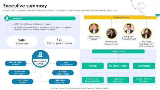 Mentioned slide displays company executive summary comprising description, key statistics, top executives, therapy areas, subsidiaries, and number of projects in pipeline. If your project calls for a presentation, then Slidegeeks is your go-to partner because we have professionally designed, easy-to-edit templates that are perfect for any presentation. After downloading, you can easily edit Executive Summary Medical Research And Development Company Profile CP SS V and make the changes accordingly. You can rearrange slides or fill them with different images. Check out all the handy templates Mentioned slide displays company executive summary comprising description, key statistics, top executives, therapy areas, subsidiaries, and number of projects in pipeline.