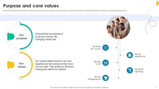 Mentioned slide provides information about company purpose and core values. It includes values such as following science, putting the patient first, playing to win, doing the right thing, etc. Here you can discover an assortment of the finest PowerPoint and Google Slides templates. With these templates, you can create presentations for a variety of purposes while simultaneously providing your audience with an eye-catching visual experience. Download Purpose And Core Values Medical Research And Development Company Profile CP SS V to deliver an impeccable presentation. These templates will make your job of preparing presentations much quicker, yet still, maintain a high level of quality. Slidegeeks has experienced researchers who prepare these templates and write high-quality content for you. Later on, you can personalize the content by editing the Purpose And Core Values Medical Research And Development Company Profile CP SS V. Mentioned slide provides information about company purpose and core values. It includes values such as following science, putting the patient first, playing to win, doing the right thing, etc.