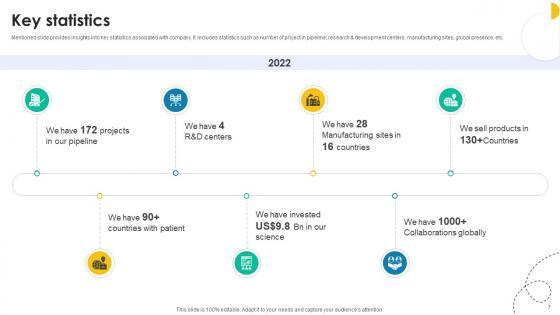 Mentioned slide provides insights into key statistics associated with company. It includes statistics such as number of project in pipeline, research and development centers, manufacturing sites, global presence, etc. This modern and well-arranged Key Statistics Medical Research And Development Company Profile CP SS V provides lots of creative possibilities. It is very simple to customize and edit with the Powerpoint Software. Just drag and drop your pictures into the shapes. All facets of this template can be edited with Powerpoint, no extra software is necessary. Add your own material, put your images in the places assigned for them, adjust the colors, and then you can show your slides to the world, with an animated slide included. Mentioned slide provides insights into key statistics associated with company. It includes statistics such as number of project in pipeline, research and development centers, manufacturing sites, global presence, etc.