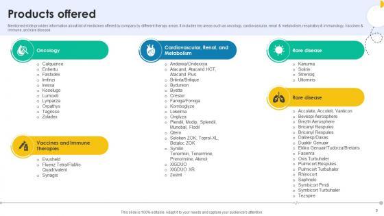 Mentioned slide provides information about list of medicines offered by company by different therapy areas. It includes key areas such as oncology, cardiovascular, renal and metabolism, respiratory and immunology, Vaccines and immune, and rare disease. Presenting this PowerPoint presentation, titled Products Offered Medical Research And Development Company Profile CP SS V, with topics curated by our researchers after extensive research. This editable presentation is available for immediate download and provides attractive features when used. Download now and captivate your audience. Presenting this Products Offered Medical Research And Development Company Profile CP SS V. Our researchers have carefully researched and created these slides with all aspects taken into consideration. This is a completely customizable Products Offered Medical Research And Development Company Profile CP SS V that is available for immediate downloading. Download now and make an impact on your audience. Highlight the attractive features available with our PPTs. Mentioned slide provides information about list of medicines offered by company by different therapy areas. It includes key areas such as oncology, cardiovascular, renal and metabolism, respiratory and immunology, Vaccines and immune, and rare disease.