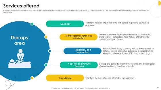 Mentioned slide provides information about company services offered that are therapy areas. It includes areas such as oncology, cardiovascular, renal and metabolism, respiratory and immunology, Vaccines and immune, and rare disease. Want to ace your presentation in front of a live audience Our Services Offered Medical Research And Development Company Profile CP SS V can help you do that by engaging all the users towards you. Slidegeeks experts have put their efforts and expertise into creating these impeccable powerpoint presentations so that you can communicate your ideas clearly. Moreover, all the templates are customizable, and easy-to-edit and downloadable. Use these for both personal and commercial use. Mentioned slide provides information about company services offered that are therapy areas. It includes areas such as oncology, cardiovascular, renal and metabolism, respiratory and immunology, Vaccines and immune, and rare disease.