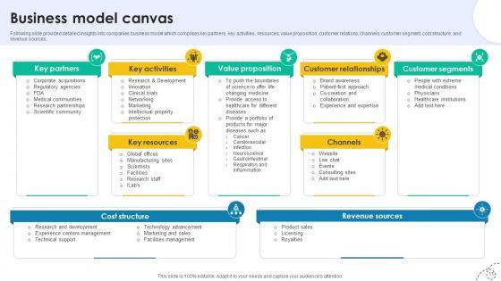 Following slide provided detailed insights into companies business model which comprises key partners, key activities, resources, value proposition, customer relations, channels, customer segment, cost structure, and revenue sources. Want to ace your presentation in front of a live audience Our Business Model Canvas Medical Research And Development Company Profile CP SS V can help you do that by engaging all the users towards you. Slidegeeks experts have put their efforts and expertise into creating these impeccable powerpoint presentations so that you can communicate your ideas clearly. Moreover, all the templates are customizable, and easy-to-edit and downloadable. Use these for both personal and commercial use. Following slide provided detailed insights into companies business model which comprises key partners, key activities, resources, value proposition, customer relations, channels, customer segment, cost structure, and revenue sources.