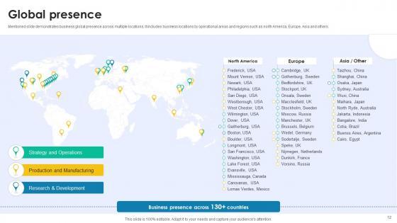Mentioned slide demonstrates business global presence across multiple locations. It includes business locations by operational areas and regions such as north America, Europe, Asia and others. Make sure to capture your audiences attention in your business displays with our gratis customizable Global Presence Medical Research And Development Company Profile CP SS V. These are great for business strategies, office conferences, capital raising or task suggestions. If you desire to acquire more customers for your tech business and ensure they stay satisfied, create your own sales presentation with these plain slides. Mentioned slide demonstrates business global presence across multiple locations. It includes business locations by operational areas and regions such as north America, Europe, Asia and others.