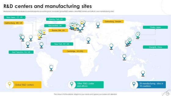 Mentioned slide demonstrates business footprints across the globe. It includes global RandD centers, other RandD centers and offices, and manufacturing sites. This R And D Centers And Manufacturing Sites Medical Research And Development Company Profile CP SS V from Slidegeeks makes it easy to present information on your topic with precision. It provides customization options, so you can make changes to the colors, design, graphics, or any other component to create a unique layout. It is also available for immediate download, so you can begin using it right away. Slidegeeks has done good research to ensure that you have everything you need to make your presentation stand out. Make a name out there for a brilliant performance. Mentioned slide demonstrates business footprints across the globe. It includes global RandD centers, other RandD centers and offices, and manufacturing sites.