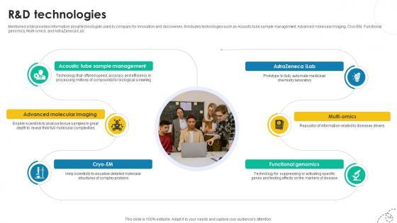 Mentioned slide provides information about technologies used by company for innovation and discoveries. It includes technologies such as Acoustic tube sample management, Advanced molecular imaging, Cryo EM, Functional genomics, Multi omics, and AstraZeneca iLab. Do you know about Slidesgeeks R And D Technologies Medical Research And Development Company Profile CP SS V These are perfect for delivering any kind od presentation. Using it, create PowerPoint presentations that communicate your ideas and engage audiences. Save time and effort by using our pre-designed presentation templates that are perfect for a wide range of topic. Our vast selection of designs covers a range of styles, from creative to business, and are all highly customizable and easy to edit. Download as a PowerPoint template or use them as Google Slides themes. Mentioned slide provides information about technologies used by company for innovation and discoveries. It includes technologies such as Acoustic tube sample management, Advanced molecular imaging, Cryo EM, Functional genomics, Multi omics, and AstraZeneca iLab.