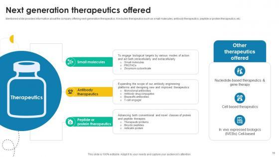 Mentioned slide provides information about the company offering next generation therapeutics. It includes therapeutics such as small molecules, antibody therapeutics, peptide or protein therapeutics, etc. The best PPT templates are a great way to save time, energy, and resources. Slidegeeks have 100 percent editable powerpoint slides making them incredibly versatile. With these quality presentation templates, you can create a captivating and memorable presentation by combining visually appealing slides and effectively communicating your message. Download Next Generation Therapeutics Offered Medical Research And Development Company Profile CP SS V from Slidegeeks and deliver a wonderful presentation. Mentioned slide provides information about the company offering next generation therapeutics. It includes therapeutics such as small molecules, antibody therapeutics, peptide or protein therapeutics, etc.