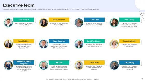 Mentioned slide provides insights into company executive team members. It includes key members such as CEO, CFO, VP RandD, Chief sustainability officer, etc. If you are looking for a format to display your unique thoughts, then the professionally designed Executive Team Medical Research And Development Company Profile CP SS V is the one for you. You can use it as a Google Slides template or a PowerPoint template. Incorporate impressive visuals, symbols, images, and other charts. Modify or reorganize the text boxes as you desire. Experiment with shade schemes and font pairings. Alter, share or cooperate with other people on your work. Download Executive Team Medical Research And Development Company Profile CP SS V and find out how to give a successful presentation. Present a perfect display to your team and make your presentation unforgettable. Mentioned slide provides insights into company executive team members. It includes key members such as CEO, CFO, VP RandD, Chief sustainability officer, etc.