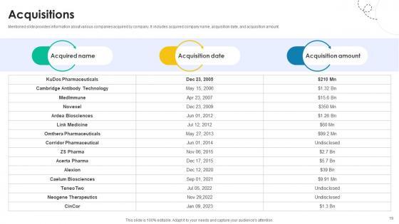 Mentioned slide provides information about various companies acquired by company. It includes acquired company name, acquisition date, and acquisition amount. Find a pre-designed and impeccable Acquisitions Medical Research And Development Company Profile CP SS V. The templates can ace your presentation without additional effort. You can download these easy-to-edit presentation templates to make your presentation stand out from others. So, what are you waiting for Download the template from Slidegeeks today and give a unique touch to your presentation. Mentioned slide provides information about various companies acquired by company. It includes acquired company name, acquisition date, and acquisition amount.