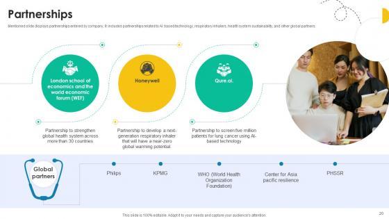 Mentioned slide displays partnerships entered by company. It includes partnerships related to AI based technology, respiratory inhalers, health system sustainability, and other global partners.Slidegeeks has constructed Partnerships Medical Research And Development Company Profile CP SS V after conducting extensive research and examination. These presentation templates are constantly being generated and modified based on user preferences and critiques from editors. Here, you will find the most attractive templates for a range of purposes while taking into account ratings and remarks from users regarding the content. This is an excellent jumping-off point to explore our content and will give new users an insight into our top-notch PowerPoint Templates. Mentioned slide displays partnerships entered by company. It includes partnerships related to AI based technology, respiratory inhalers, health system sustainability, and other global partners.