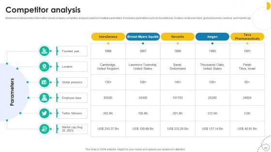 Mentioned slide provides information about company competitor analysis based on multiple parameters. It includes parameters such as founded year, location, employee base, global presence, revenue, and market cap. Do you have to make sure that everyone on your team knows about any specific topic I yes, then you should give Competitor Analysis Medical Research And Development Company Profile CP SS V a try. Our experts have put a lot of knowledge and effort into creating this impeccable Competitor Analysis Medical Research And Development Company Profile CP SS V. You can use this template for your upcoming presentations, as the slides are perfect to represent even the tiniest detail. You can download these templates from the Slidegeeks website and these are easy to edit. So grab these today Mentioned slide provides information about company competitor analysis based on multiple parameters. It includes parameters such as founded year, location, employee base, global presence, revenue, and market cap.