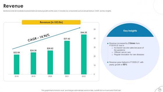 Mentioned slide demonstrates business historical revenue growth over the years. It includes key components such as annual revenue, CAGR, and key insights. Boost your pitch with our creative Revenue Medical Research And Development Company Profile CP SS V. Deliver an awe-inspiring pitch that will mesmerize everyone. Using these presentation templates you will surely catch everyones attention. You can browse the ppts collection on our website. We have researchers who are experts at creating the right content for the templates. So you do not have to invest time in any additional work. Just grab the template now and use them. Mentioned slide demonstrates business historical revenue growth over the years. It includes key components such as annual revenue, CAGR, and key insights.