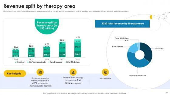 Mentioned slide provides information about company revenue split by therapy areas. It includes areas such as oncology, biopharmaceuticals, rare diseases, and other medicines. Slidegeeks is one of the best resources for PowerPoint templates. You can download easily and regulate Revenue Split By Therapy Area Medical Research And Development Company Profile CP SS V for your personal presentations from our wonderful collection. A few clicks is all it takes to discover and get the most relevant and appropriate templates. Use our Templates to add a unique zing and appeal to your presentation and meetings. All the slides are easy to edit and you can use them even for advertisement purposes. Mentioned slide provides information about company revenue split by therapy areas. It includes areas such as oncology, biopharmaceuticals, rare diseases, and other medicines.