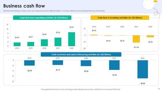 Mentioned slide displays company yearly cash obtained and used in different activities. It includes activities such as operating, financing, and investing. Boost your pitch with our creative Business Cash Flow Medical Research And Development Company Profile CP SS V. Deliver an awe-inspiring pitch that will mesmerize everyone. Using these presentation templates you will surely catch everyones attention. You can browse the ppts collection on our website. We have researchers who are experts at creating the right content for the templates. So you do not have to invest time in any additional work. Just grab the template now and use them. Mentioned slide displays company yearly cash obtained and used in different activities. It includes activities such as operating, financing, and investing.