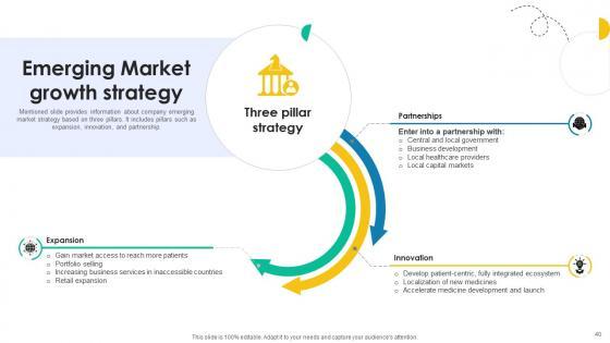 Mentioned slide provides information about company emerging market strategy based on three pillars. It includes pillars such as expansion, innovation, and partnership. Do you have an important presentation coming up Are you looking for something that will make your presentation stand out from the rest Look no further than Emerging Market Growth Strategy Medical Research And Development Company Profile CP SS V. With our professional designs, you can trust that your presentation will pop and make delivering it a smooth process. And with Slidegeeks, you can trust that your presentation will be unique and memorable. So why wait Grab Emerging Market Growth Strategy Medical Research And Development Company Profile CP SS V today and make your presentation stand out from the rest Mentioned slide provides information about company emerging market strategy based on three pillars. It includes pillars such as expansion, innovation, and partnership.