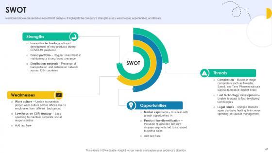 Mentioned slide represents business SWOT analysis. It highlights the companys strengths areas, weaknesses, opportunities, and threats.There are so many reasons you need a Swot Medical Research And Development Company Profile CP SS V. The first reason is you can not spend time making everything from scratch, Thus, Slidegeeks has made presentation templates for you too. You can easily download these templates from our website easily. Mentioned slide represents business SWOT analysis. It highlights the companys strengths areas, weaknesses, opportunities, and threats.