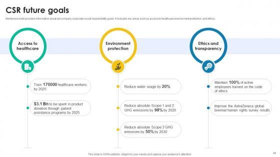 Mentioned slide provides information about set company corporate social responsibility goals. It includes key areas such as access to healthcare environment protection, and ethics. From laying roadmaps to briefing everything in detail, our templates are perfect for you. You can set the stage with your presentation slides. All you have to do is download these easy-to-edit and customizable templates. Csr Future Goals Medical Research And Development Company Profile CP SS V will help you deliver an outstanding performance that everyone would remember and praise you for. Do download this presentation today. Mentioned slide provides information about set company corporate social responsibility goals. It includes key areas such as access to healthcare environment protection, and ethics.