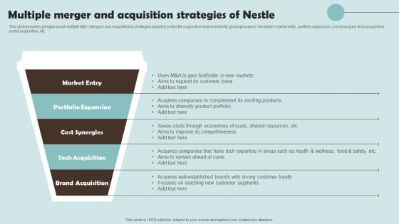 This slide provides glimpse about multiple MandA Mergers and Acquisitions strategies adopted by Nestle corporation that boosted its global presence. It includes market entry, portfolio expansion, cost synergies, tech acquisition, brand acquisition, etc.Make sure to capture your audiences attention in your business displays with our gratis customizable Multiple Merger And Acquisition Strategies Of Nestle Outline Of Nestle Management Themes Pdf. These are great for business strategies, office conferences, capital raising or task suggestions. If you desire to acquire more customers for your tech business and ensure they stay satisfied, create your own sales presentation with these plain slides. This slide provides glimpse about multiple MAndA Mergers and Acquisitions strategies adopted by Nestle corporation that boosted its global presence. It includes market entry, portfolio expansion, cost synergies, tech acquisition, brand acquisition, etc.