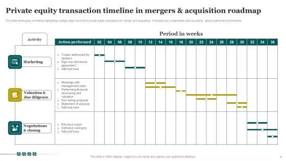 This slide showcases a timeline highlighting multiple steps involved in private equity transaction for merger and acquisition. It includes key components such as activity, actions performed and timeline. Showcasing this set of slides titled Private Equity Transaction Timeline In Mergers And Acquisition Roadmap Microsoft PDF. The topics addressed in these templates are Marketing, Valuation Due Diligence, Negotiations Closing. All the content presented in this PPT design is completely editable. Download it and make adjustments in color, background, font etc. as per your unique business setting.