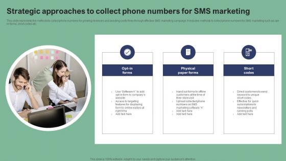 This slide represents the methods to collect phone numbers for growing revenues and avoiding costly fines through effective SMS marketing campaign. It includes methods to collect phone numbers for SMS marketing such as opt in forms, short codes etc Are you in need of a template that can accommodate all of your creative concepts This one is crafted professionally and can be altered to fit any style. Use it with Google Slides or PowerPoint. Include striking photographs, symbols, depictions, and other visuals. Fill, move around, or remove text boxes as desired. Test out color palettes and font mixtures. Edit and save your work, or work with colleagues. Download Strategic Approaches To Collect Phone Text Message Advertising Solutions Enhancing Rules Pdf and observe how to make your presentation outstanding. Give an impeccable presentation to your group and make your presentation unforgettable. This slide represents the methods to collect phone numbers for growing revenues and avoiding costly fines through effective SMS marketing campaign. It includes methods to collect phone numbers for SMS marketing such as opt in forms, short codes etc