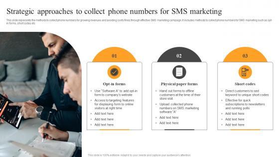This slide represents the methods to collect phone numbers for growing revenues and avoiding costly fines through effective SMS marketing campaign. It includes methods to collect phone numbers for SMS marketing such as opt-in forms, short codes etc. Find highly impressive Strategic Approaches To Collect Phone Numbers Text Message Marketing Strategies Demonstration Pdf on Slidegeeks to deliver a meaningful presentation. You can save an ample amount of time using these presentation templates. No need to worry to prepare everything from scratch because Slidegeeks experts have already done a huge research and work for you. You need to download Strategic Approaches To Collect Phone Numbers Text Message Marketing Strategies Demonstration Pdf for your upcoming presentation. All the presentation templates are 100 percent editable and you can change the color and personalize the content accordingly. Download now. This slide represents the methods to collect phone numbers for growing revenues and avoiding costly fines through effective SMS marketing campaign. It includes methods to collect phone numbers for SMS marketing such as opt-in forms, short codes etc.