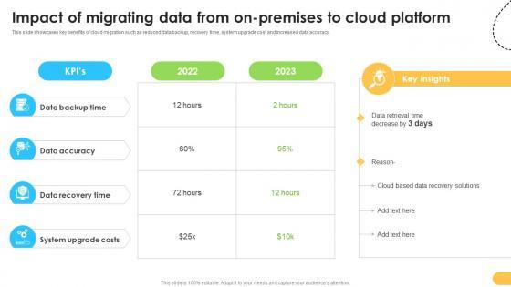 This slide showcases key benefits of cloud migration such as reduced data backup, recovery time, system upgrade cost and increased data accuracy. Explore a selection of the finest Effective Data Migration Impact Of Migrating Data From On Premises To Cloud here. With a plethora of professionally designed and pre-made slide templates, you can quickly and easily find the right one for your upcoming presentation. You can use our Effective Data Migration Impact Of Migrating Data From On Premises To Cloud to effectively convey your message to a wider audience. Slidegeeks has done a lot of research before preparing these presentation templates. The content can be personalized and the slides are highly editable. Grab templates today from Slidegeeks. This slide showcases key benefits of cloud migration such as reduced data backup, recovery time, system upgrade cost and increased data accuracy.
