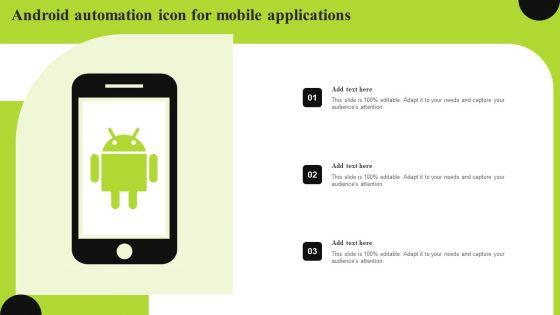 Presenting Android Automation Icon For Mobile Applications Summary PDF to dispense important information. This template comprises three stages. It also presents valuable insights into the topics including Android Automation, Mobile, Applications. This is a completely customizable PowerPoint theme that can be put to use immediately. So, download it and address the topic impactfully.