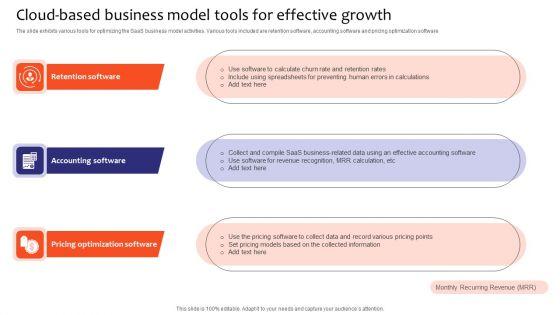 The slide exhibits various tools for optimizing the SaaS business model activities. Various tools included are retention software, accounting software and pricing optimization software. Presenting Cloud Based Business Model Tools For Effective Growth Topics PDF to dispense important information. This template comprises three stages. It also presents valuable insights into the topics including Retention Software, Accounting Software, Pricing Optimization Software. This is a completely customizable PowerPoint theme that can be put to use immediately. So, download it and address the topic impactfully.